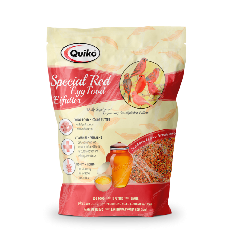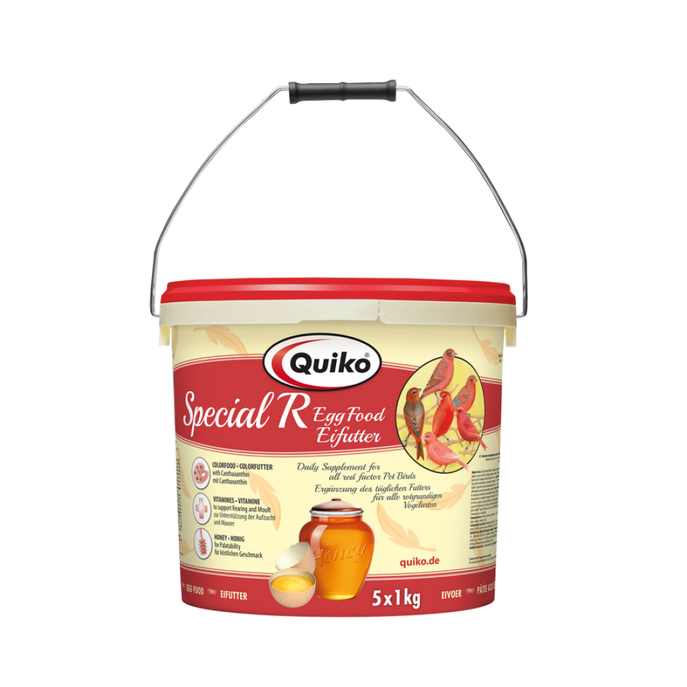 عبارة عن غذاء مركز عالي الجودة لجميع أنواع الطيور ذات الأرض الحمراء، مثل الكناري الأحمر وطيور السسكن الناري وطيور الغابات. أنه يحتوي على العناصر الغذائية التي تحتاجها الطيور الصغيرة والبالغة أثناء التكاثر والانسلاخ. يحتوي Quiko Special R أيضًا على الكانثاكسانثين/الكاروفيل والعديد من الفيتامينات ويمكن إطعامه على مدار العام كغذاء مكيف. عند تربية طيور الغابة، يوصى بتكملة طعام البيض بالبروتين الحيواني (مثل الخنصر أو الجاموس أو ديدان الوجبة).