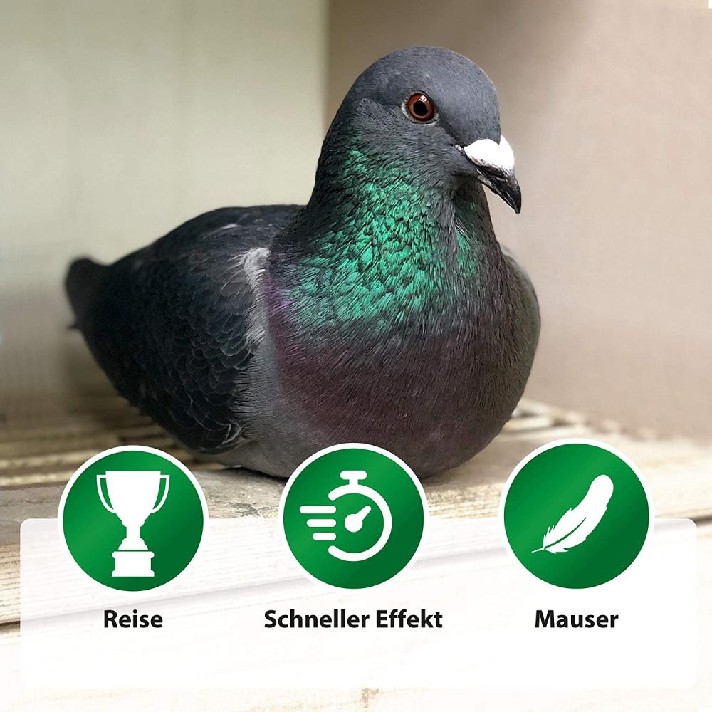. يحتوي على أحماض أمينية خاصة سهلة الإمتصاص (نوع خاص قصير السلسلة) وإلكتروليتات وفيتامين -ب- B- بتركيبة معينة. توفر هذه الأحماض الأمينية (البروتينات) يجعل الحمام يسترجع لياقته بسرعة ويزيل حالة الضغط والإرهاق الجسدي والنفسي أثناء فترة العلاج بالأدوية والمضادات وخلال فترة السباق والإجهاد. وجود فيتامين -ب- B- بهذا التركيز العالي يرفع من مستوى تكوين الكريات الحمراء الدموية ويقوي الجهاز العصبي عند الحمام، مما يجعله من الأساسيات خلال فترة السباق.
