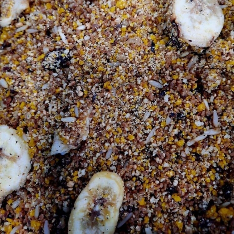 - غذاء غني بالبروتينات عالية القيمة البيولوجية المخصبة بالفواكهة والبيض والحشرات والقشريات لتليينها بالفواكهة الطازجة المبشورة او نصف المطبوخة