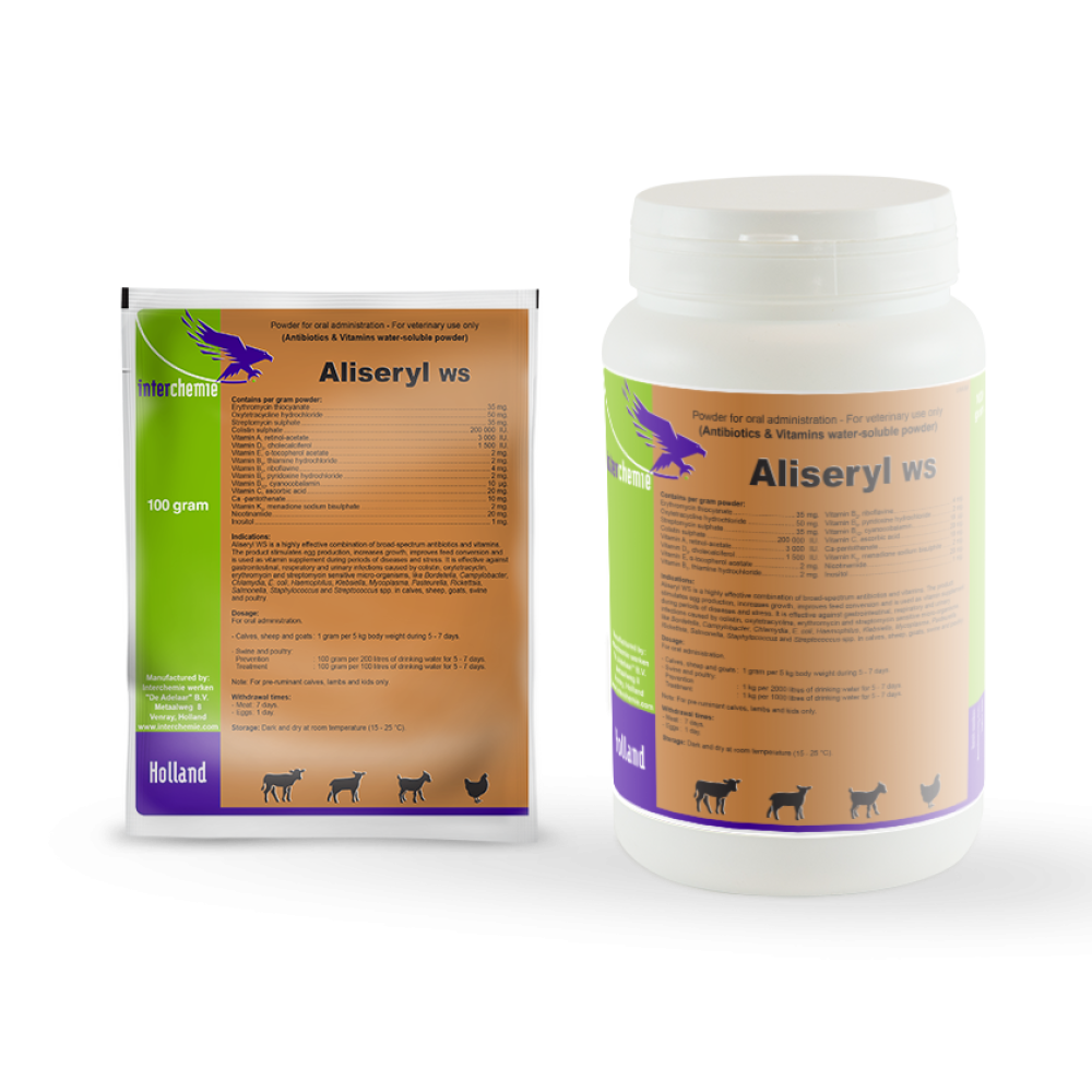 أليسيريل دبليو هو مزيج فعال للغاية من المضادات الحيوية والفيتامينات واسعة النطاق . كوليستين هو مضاد حيوي من مجموعة البوليميكسينات وله تأثير مبيد للبكتيريا ضد البكتيريا سالبة الجرام مثل شريك القولونية والمستدمية والسالمونيلا. بما في ذلك أنه يتم تشخيصه بجزء صغير جدًا بعد تناوله عن طريق الفم، فإن مؤشرات الإصابة هي فقط ذات الصلة. تتميز أوكسي تتراسيكلين إلى مجموعة التراسيكلين لأنها مثبط للجراثيم ضد العديد من البكتيريا جاء الجرام والسالبة الجرام مثل بورديتيلا، العطيفة، الكلاميديا، الشريكة القولونية، المستدمية، الميكوبلازما، الباستوريلا، الريكيتسيا، السالمونيلا، المكورات العنقودية والمكورات العقدية. يعتمد عمل الأوكسيتراسيكلين على الكبد ويخلص البروتين البكتيري. يفرز الأوكسيتراسيكلين بشكل رئيسي في الأقراص الصلبة، وجزء صغير في الغلوتين وفي منتجات الألبان في الجبن. الاريثروميسين هو ماكرولايد يعمل على الجراثيم بشكل رئيسي ضد البكتيريا وجاء الجرام مثل البكتيريا العنقودية والمكورات العقدية. الستربتوميسين هو أمينوغليكوزيد له تأثير مبيد على البكتيريا سالبة الجرام مثل إيكولاي و كلابسيلا و باستوريلا و سالمونيلا . والميكوبلازما. المتطلبات الضرورية والضرورية للبقاء على قيد الحياة والعديد من الوظائف الفسيولوجية .